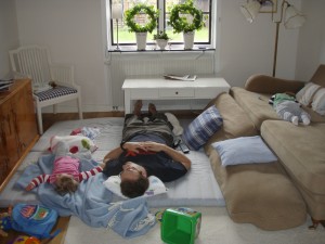Då har det gått 12 timmar. 12 timmar sedan vi satt i soffan och konstaterade att det är 12 timmar kvar tills barnen ligger i sina sängar för natten. Nu är vi där, skönt!