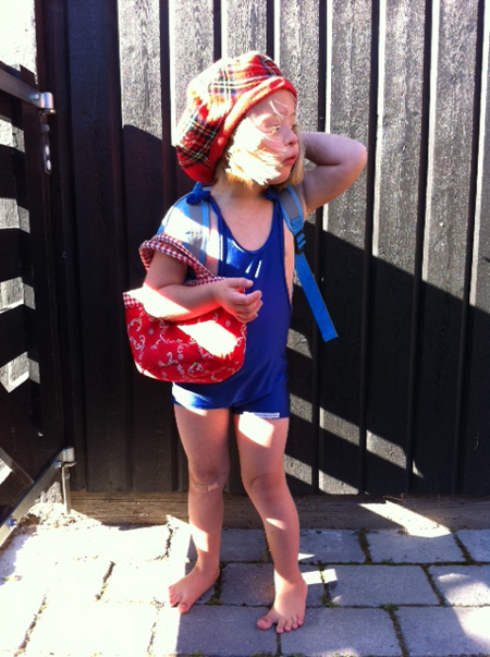 Elvira vill gå till grannen. Hon har klätt sig i pappas gamla brottardräkt och en tant-mössa. Â